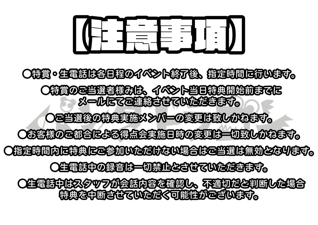 特賞・生電話会への参加をご希望される方は特典会開催予定時間(19:30-20:30)頃を予定)に電話に出られる方
